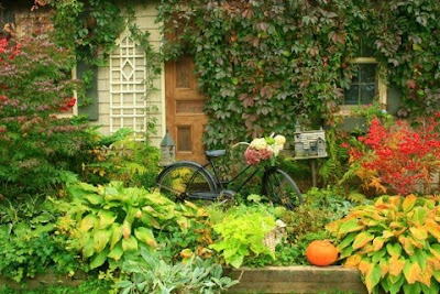 I love how your old entrance door looks...all those beautiful vines, flowers and ohhh, that old bicycle! It does look just like an English garden, Darlin'!!! Sooo very beautiful!!! I spied that little pumpkin too!