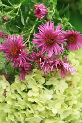 The colors are gorgeous...those purple asters are too too...I can't hardly take it all in, Carolyn, it's just so beautiful. Love that you left the door there...it looks wonderful there, along with your dad's bike...what a wonderful landscape you've created. I just left Arizona where my two brothers built homes out in the desert...what a contrast! They don't have a single blade of grass...it was hard for me to look outside without wanting to come home to my roses, and then to contrast with yours yard...what a difference!