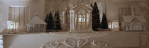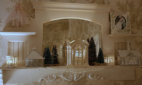 I got the white house in the middle at Marden's in Bangor last year. It has mirrors in it -so a candle gives it a nice glow.The little houses came from TJMAXX . Come to think of it the shelf came from a thrift shop there also. This display is in the guest room upstairs with the green and white toile wallpaper.