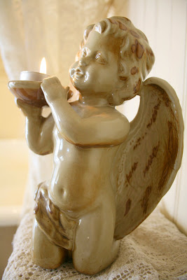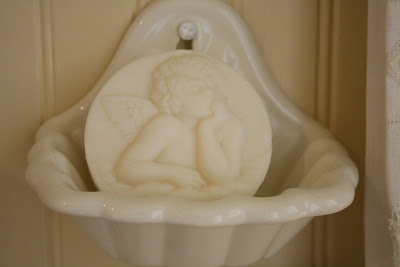 The new white look is beautiful. Since I love white, I think it is nicer this way. Love the small lamp with crystals on the sink. I have the same cherub soaps. I just love them, don't you?