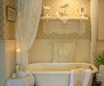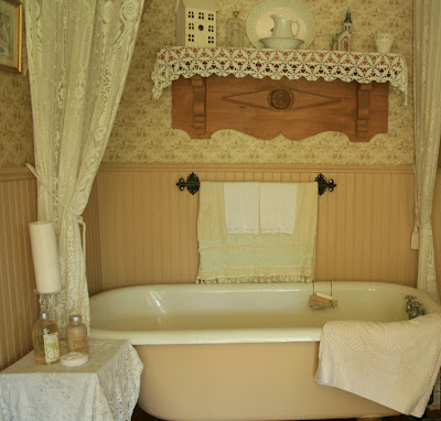 Ohh my...you have been a busy little bee with all of your projects! My friend, your bath turned out fabulous! I do declare that it is one of the prettiest baths that I've ever seen...I just love the olden sink and claw foot tub! The paint color that you chose for the trim, etc. is beautiful! I love how you painted outer surround of the tub to match...gorgeous! Love your new sink curtain...ohhh, and all that pretty lace in that room! Thank you so much for sharing it with us, Carolyn!