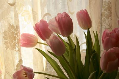 I bought some yellow tulips (and a few daffodils, too) and took them to school. The students loved them and each day they were more lovely. Yesterday, I took several pictures of the sun shining through the green stems - breathtaking. I love your pink tulips. Tulips look good enough to eat. I grew up around miles of tulip beds - they'll always be my home flower.