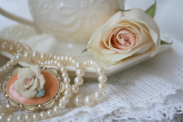 Carolyn....Yes....a very plesant way to start my day! I love the pearls with the creamy white cup and the delicate petals of the rose. Lovely photography!~Patti