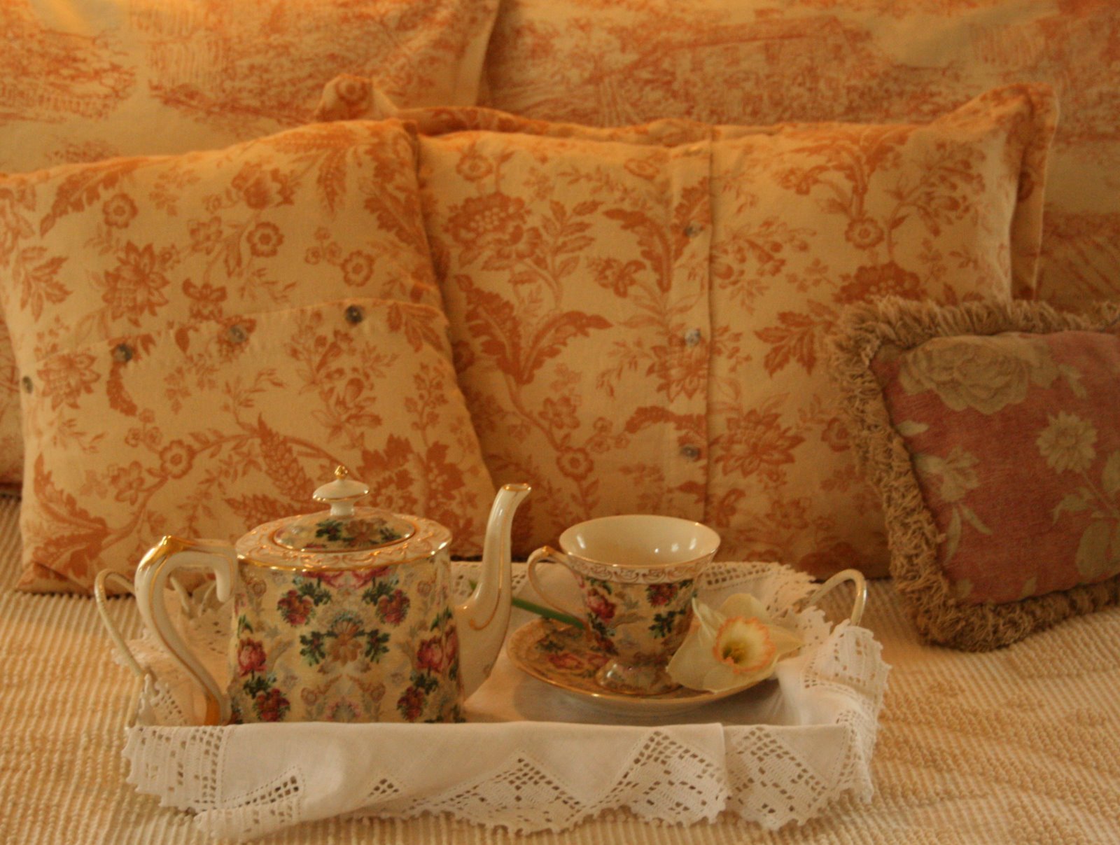 Oh My! I am in love! Your bedroom is so lovely! What a great job you have done bring it together! I so wanted to get a closer view of the chase and of the sheers tops around the bed! I designing our bedroom which will take a while, I so want a chase lounge! I want curtains around my bed, but not heavy! This is perfect! I also love the tea tray, so lovely in your bedroom. I was just going through updates on my Dashboard and saw your bed, I see my Tea Time Tuesday logo, Wished you would have linked this beautiful bedroom! I so glad I didn't miss it just love it!