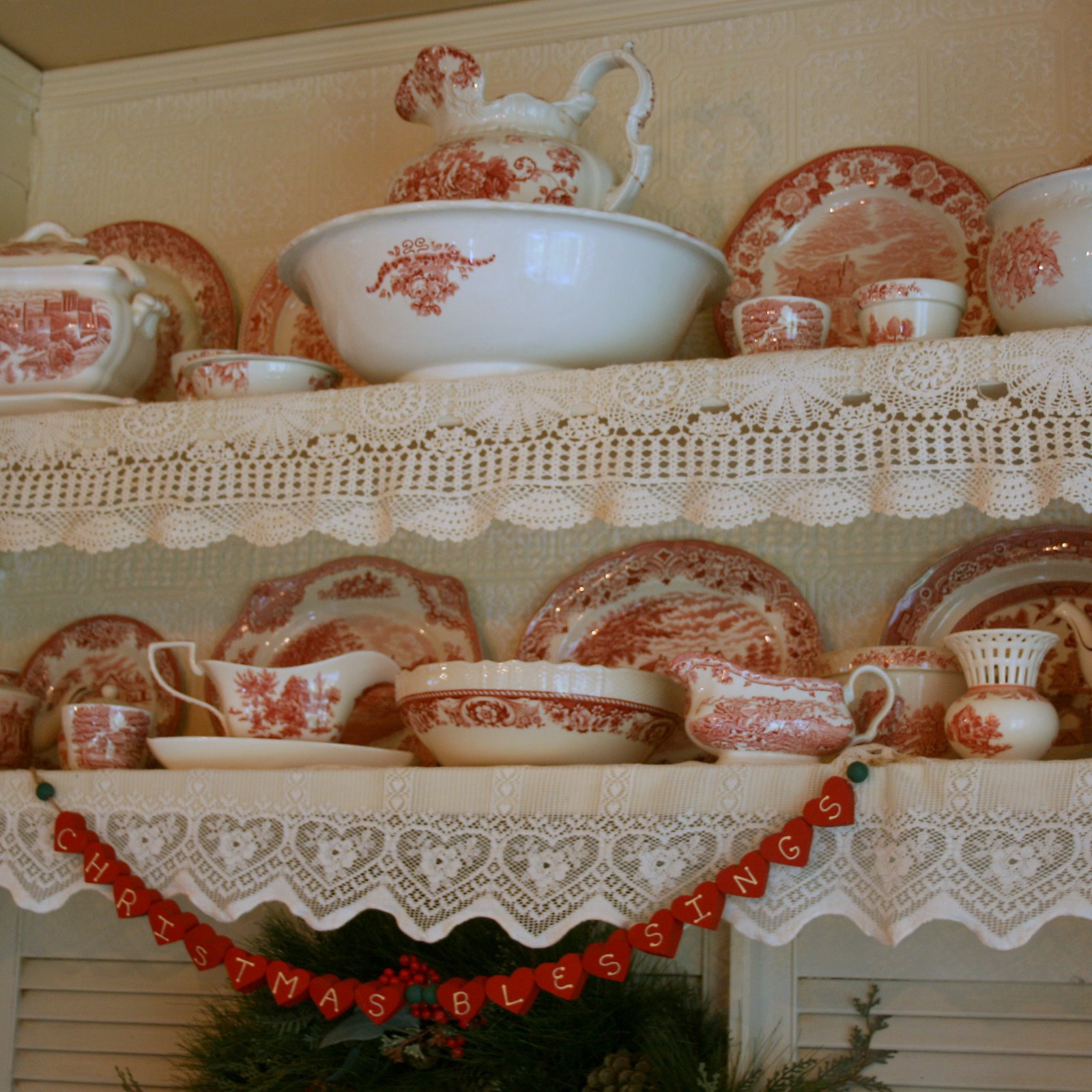 Very pretty Christmas decorations! The red and white china looks beautiful in your dresser.