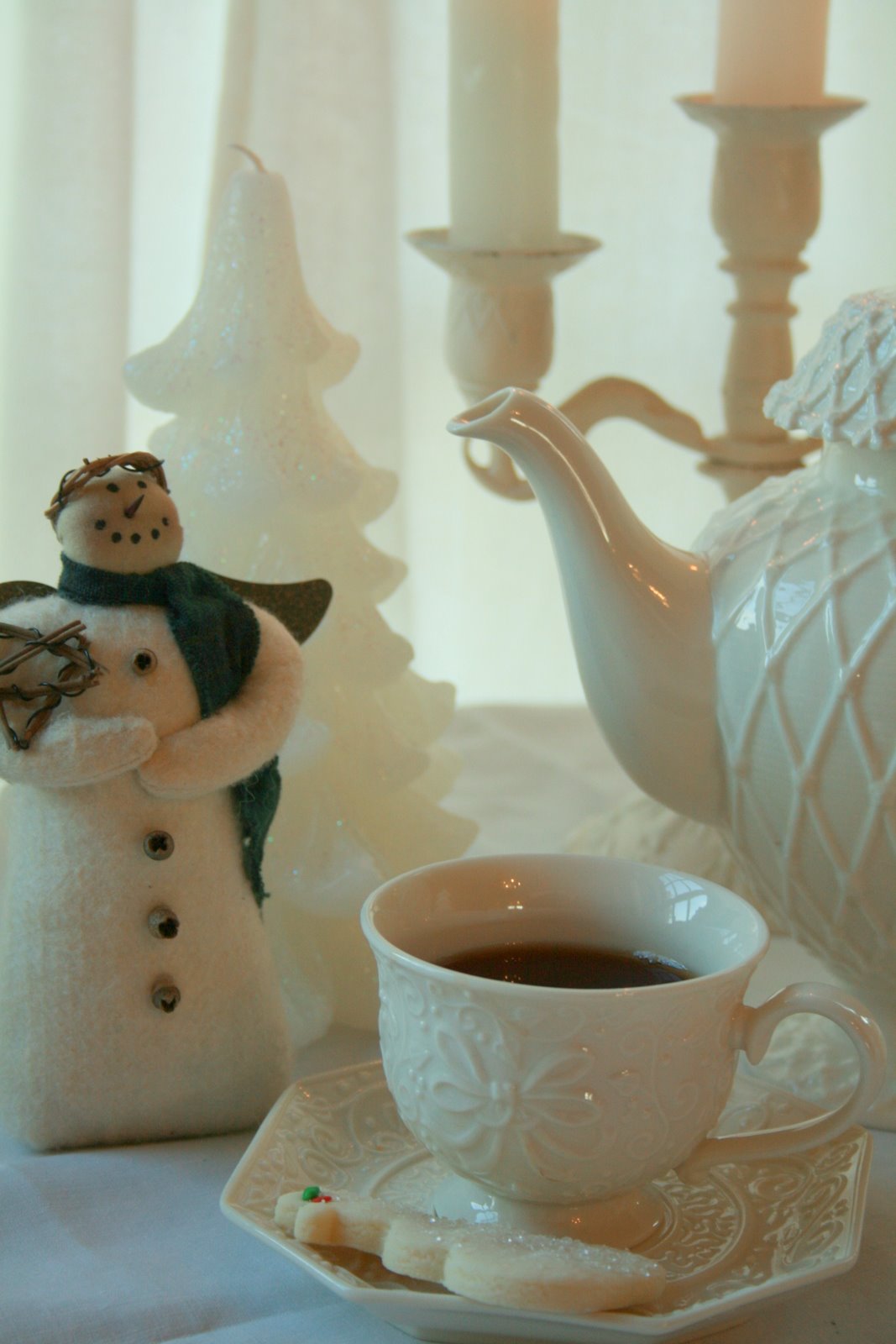 Your white tea is so pretty and yes, soothing! The cookies look wonderful! I do love your white tea pot. I have been keeping my eye out for one just like it because I have admired it so often but none to be found around here. Truth is, when I look at all my tea pots, I have more white ones than any other colour! Perhaps I should be looking for different hues although I am drawn to the white and red transferware too, of course. Thank you for a lovely post and have a beautiful day.