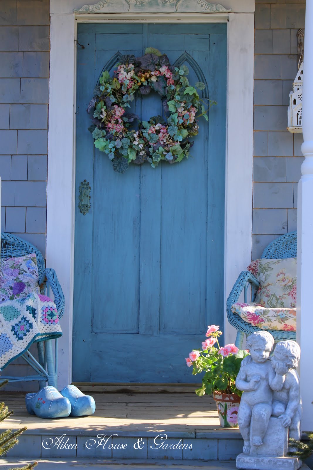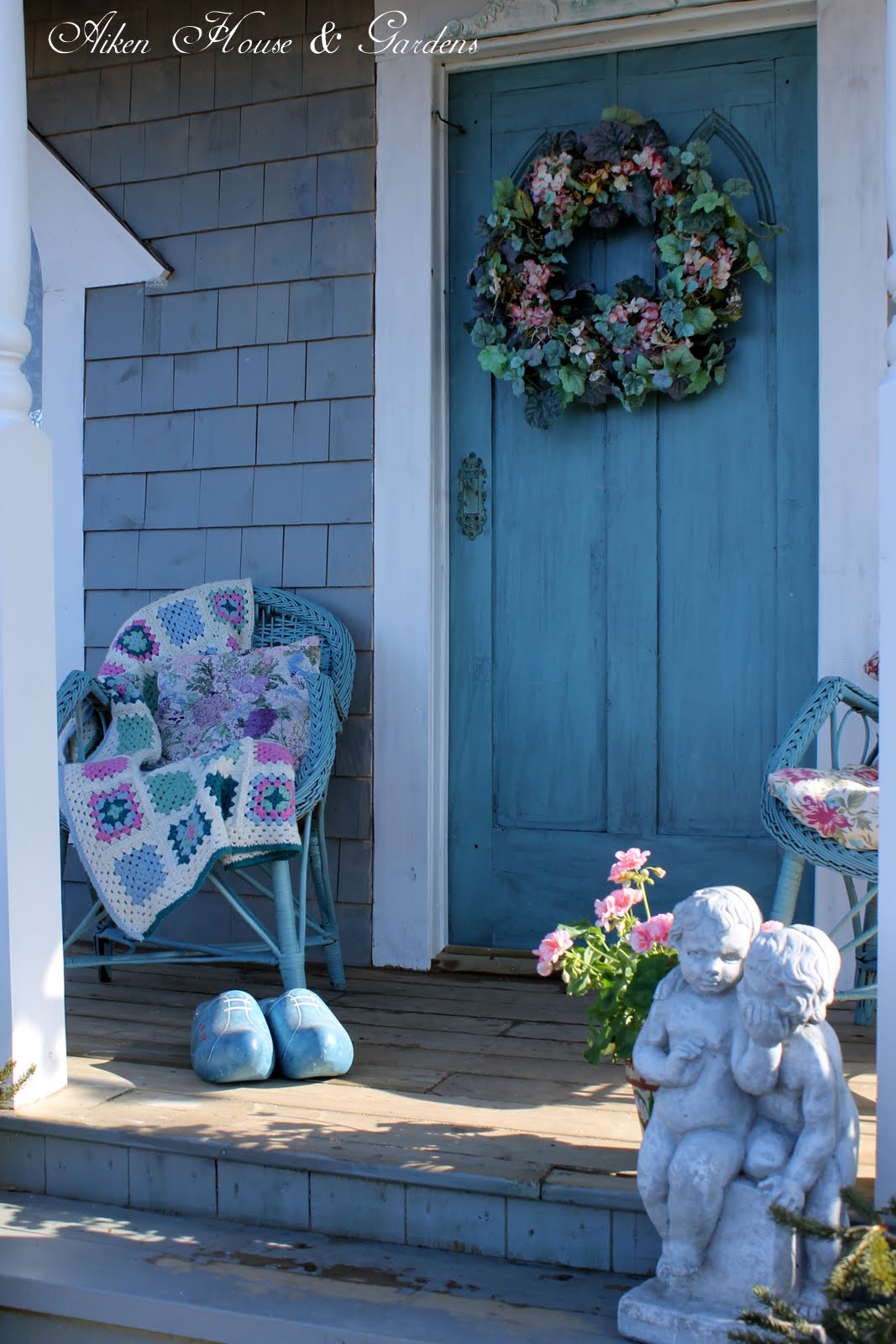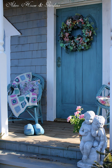 I love the front door and wicker blue chair and adore the granny blanket..the colors are wonderful... can't wait to see the new linens..Happy new week..with love Janice