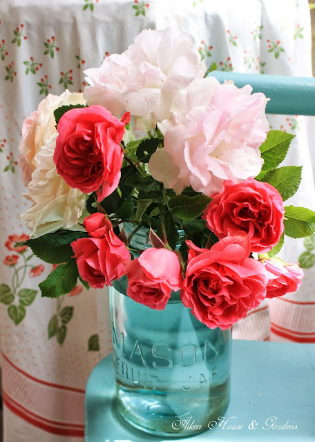 I love red so that red watering can would definitely have gotten my attention, especially on sale! :D Why do flowers always look so pretty in those blue Mason jars? It is so refreshing to pop over here to your blog for garden visits!
