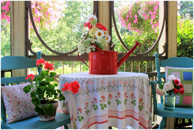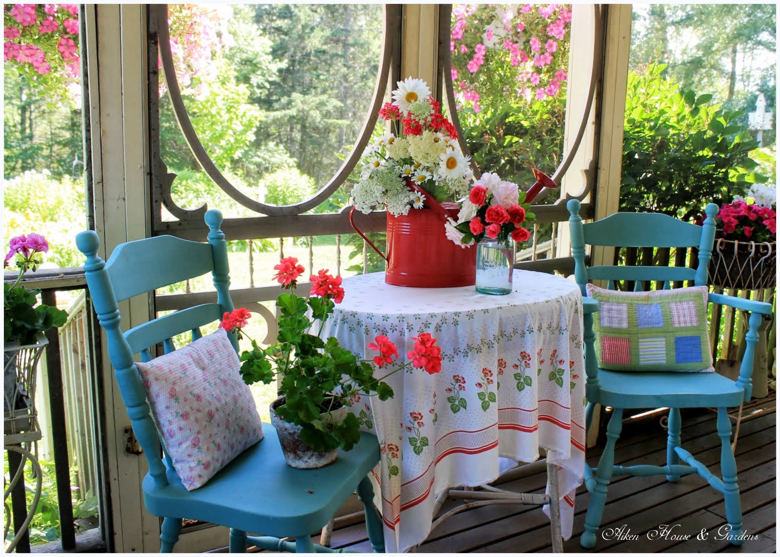 I'm loving the turquoise chairs and the red accents in your porch. It looks perfectly summery there. The tablecloth is so pretty. It is hard to believe some of the garden centres are closed although the greenhouses are still selling perennials and a few annuals around here. Great for late season gardeners. Blessings. Pam