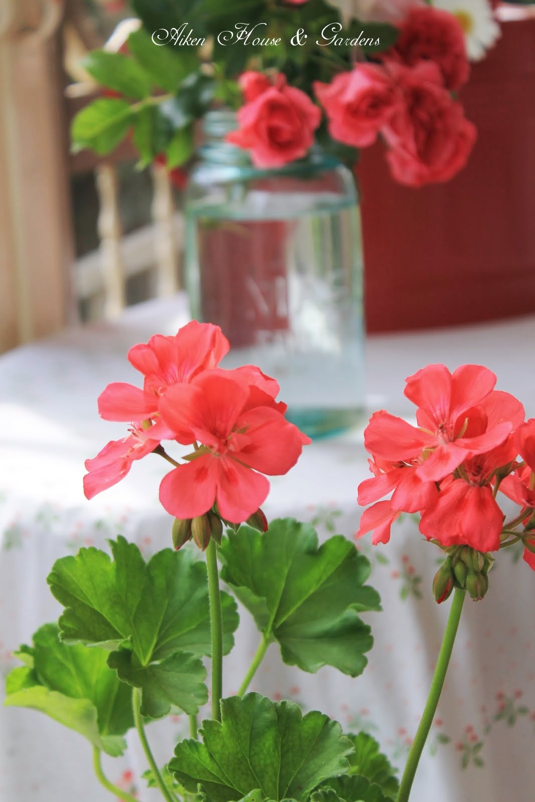 Oh those two colors together are just lovely and with those coral geraniums...yummy!! Beautiful spot, can't believe your garden center is closing already...what happened to all the fall plantings??