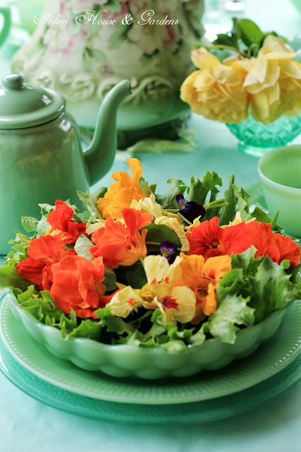 Snow's Jadeite collection is lovely and your enamel teapot matches it well. Nasturtiums add a nice splash of colour to a salad, yours looks delicious.