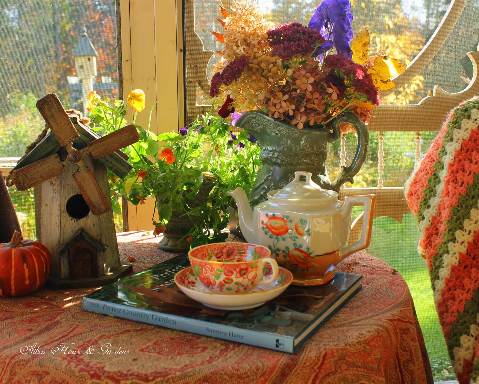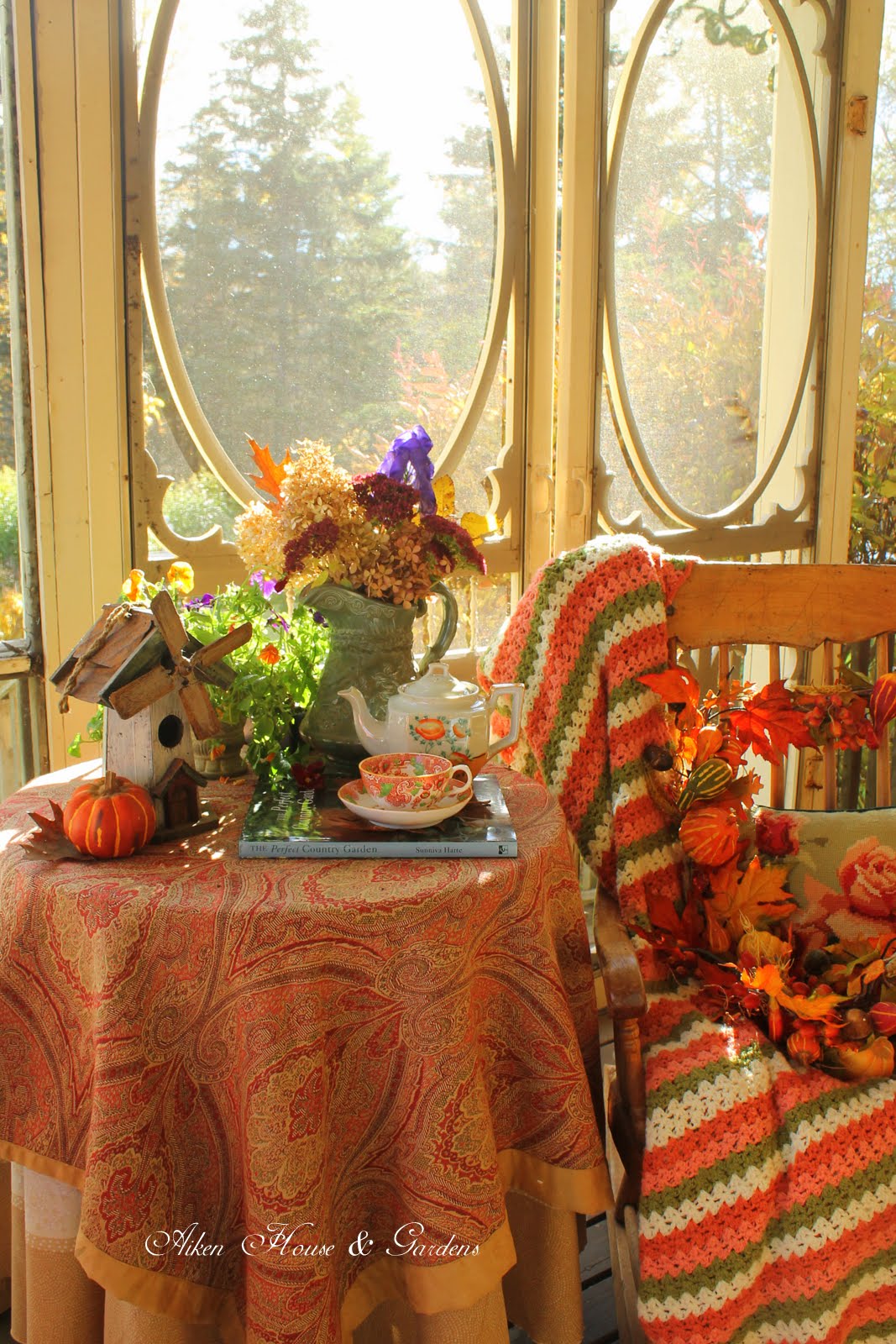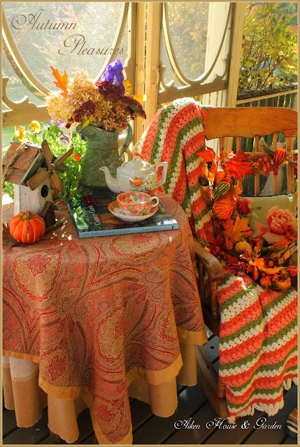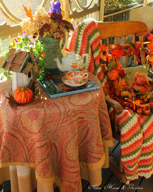 What a beautiful Fall vignette! I'd love to sit in this cozy spot and sip some tea out of that lovely cup!
