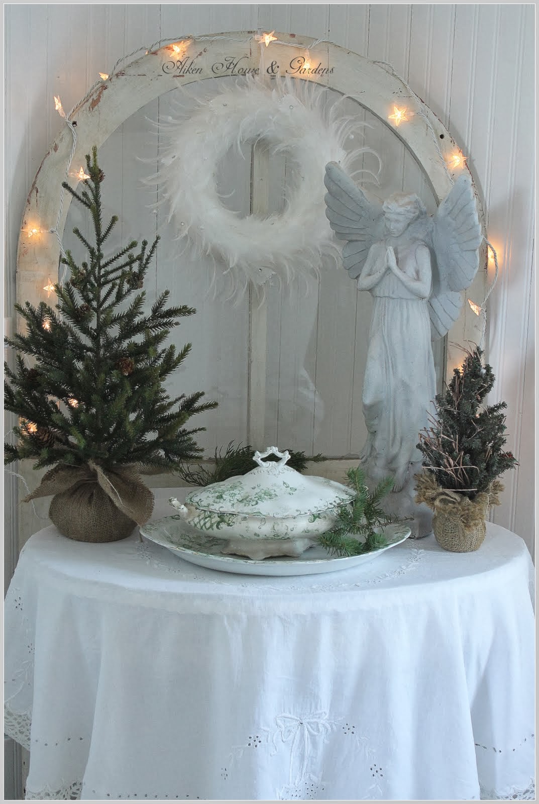 Your vignette is so peaceful. Your green transferware is gorgeous, I'll have to keep my eyes on the look out for some:-) Those little star lights are adorable too :-)