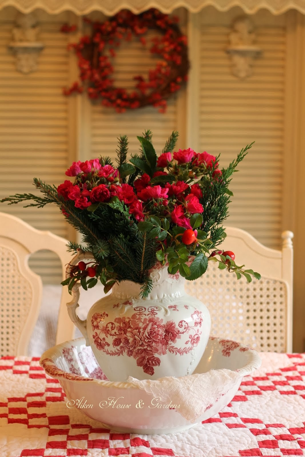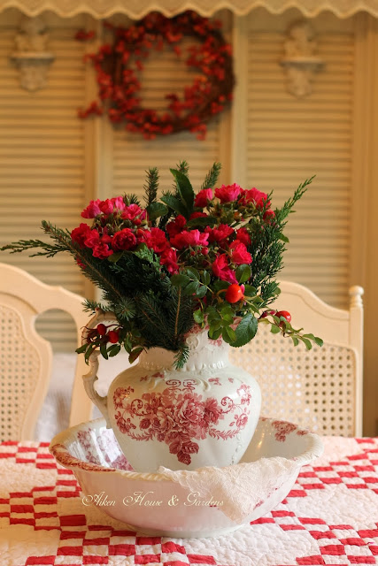 I love red and white at Christmas and your table looks so lovely with the quilt on it and the other red items. I have added some red to my decor this year too. I think it just says Christmas. I like your little bunch of rose hips with the green leaves. Have a lovely weekend and enjoy your brunch.