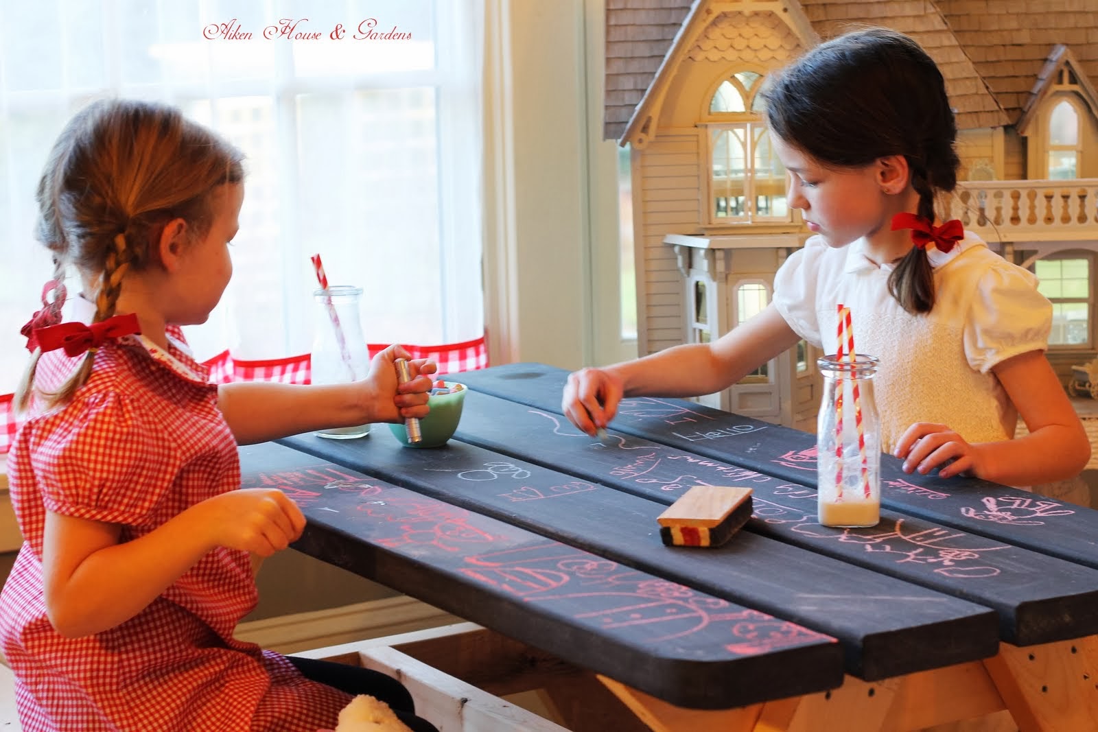 The picnic table has a chalk top which the girls love as they