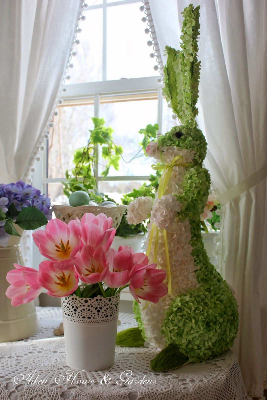 Such a pretty post, Carolyn. Love the fabrics with your pretty tea set. I like poms poms too. The bunny is adorable and the ivy growing around the heart shaped wire wreath is lovely!