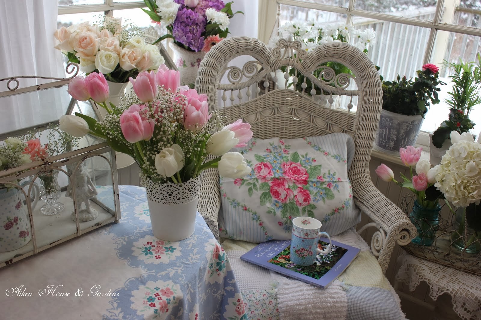 You have created a sunny atmosphere inside your home. The tea time mugs are so pretty with the blue plus the roses decorations. I love how you coordinated the new pillows with the blues and pinks. Each blue jar of flowers gives your home a garden feel. Have a grand time in your sweet home and may spring time come soon!