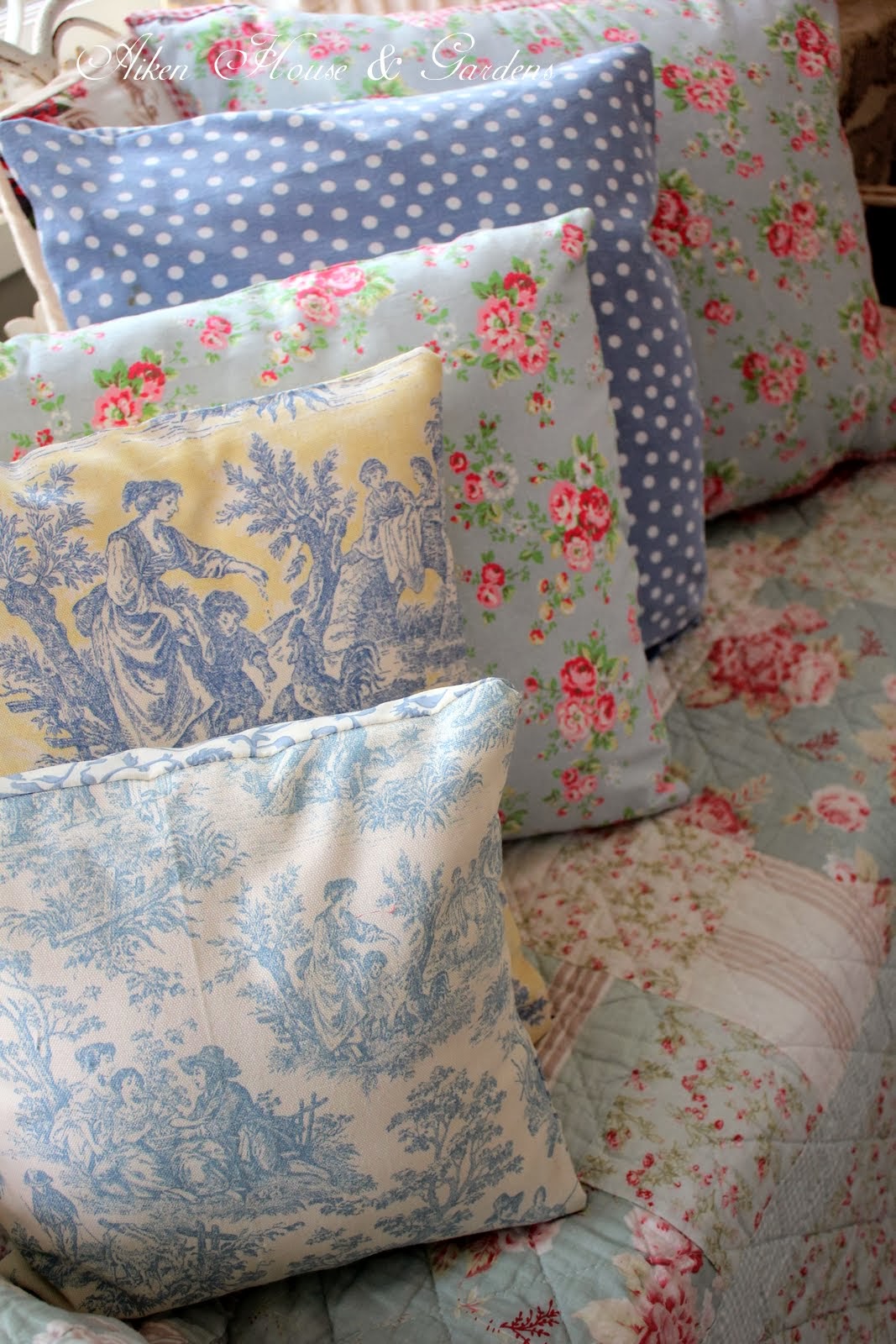 What darling pillows, Carolyn! I love the toiles and all the aqua. The quilt from your girls is pretty too. Lovely posies and tea mug. Thank you for sharing and joining me for tea today. Let's hope this newest storm heading our way is the last of the season.