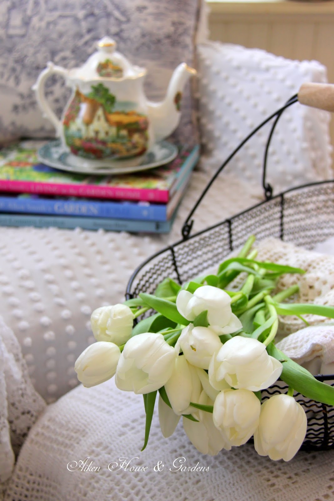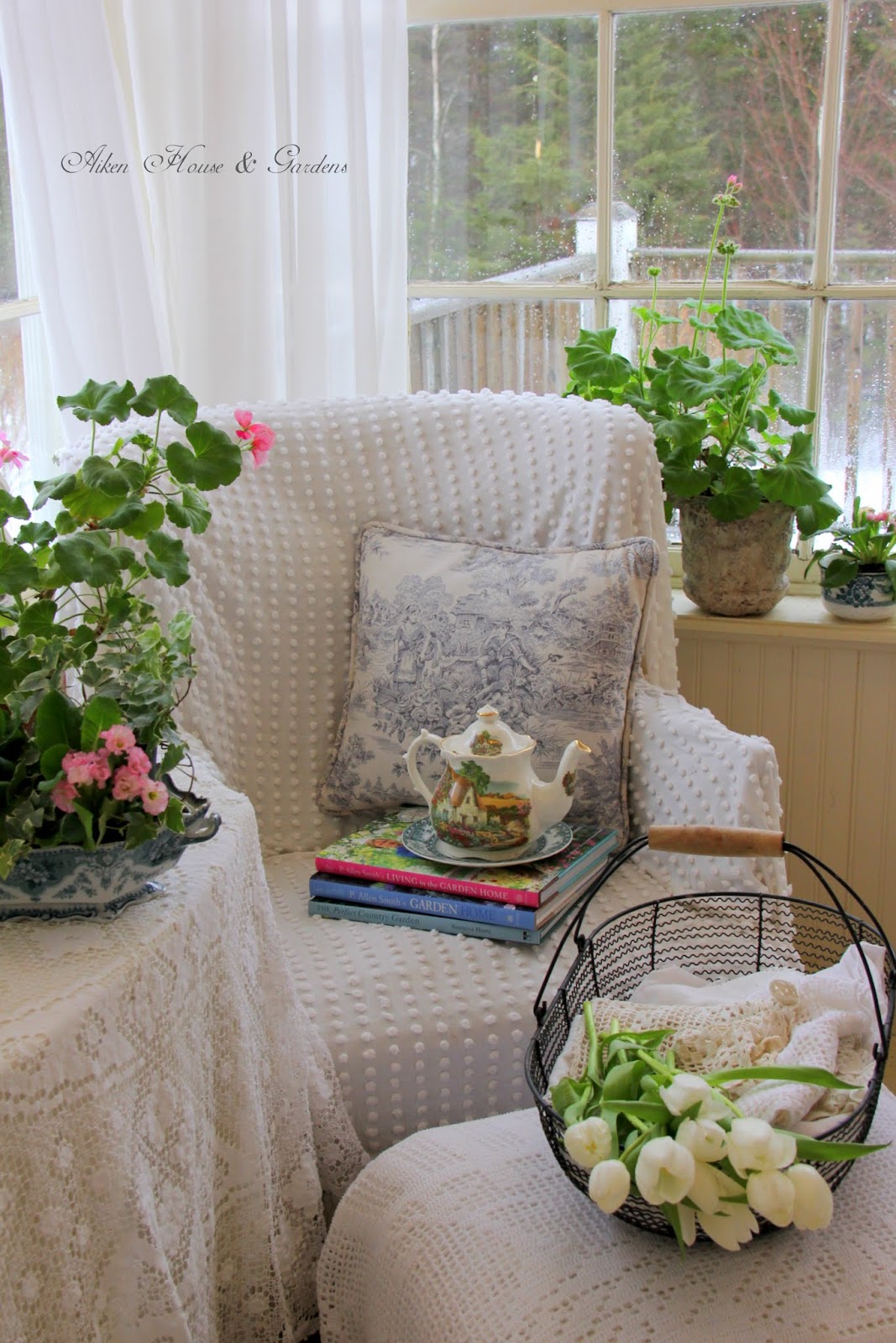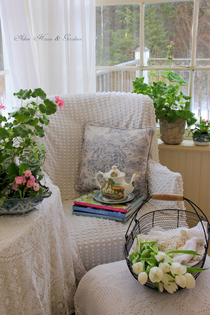 Lovely spot to enjoy those pretty garden books and the sounds of rain. I enjoy watching P. Allen's TV show very much. They always have great ideas for the garden and home. Weather has been mild here to the last few days. I am finally seeing signs of spring ahead.