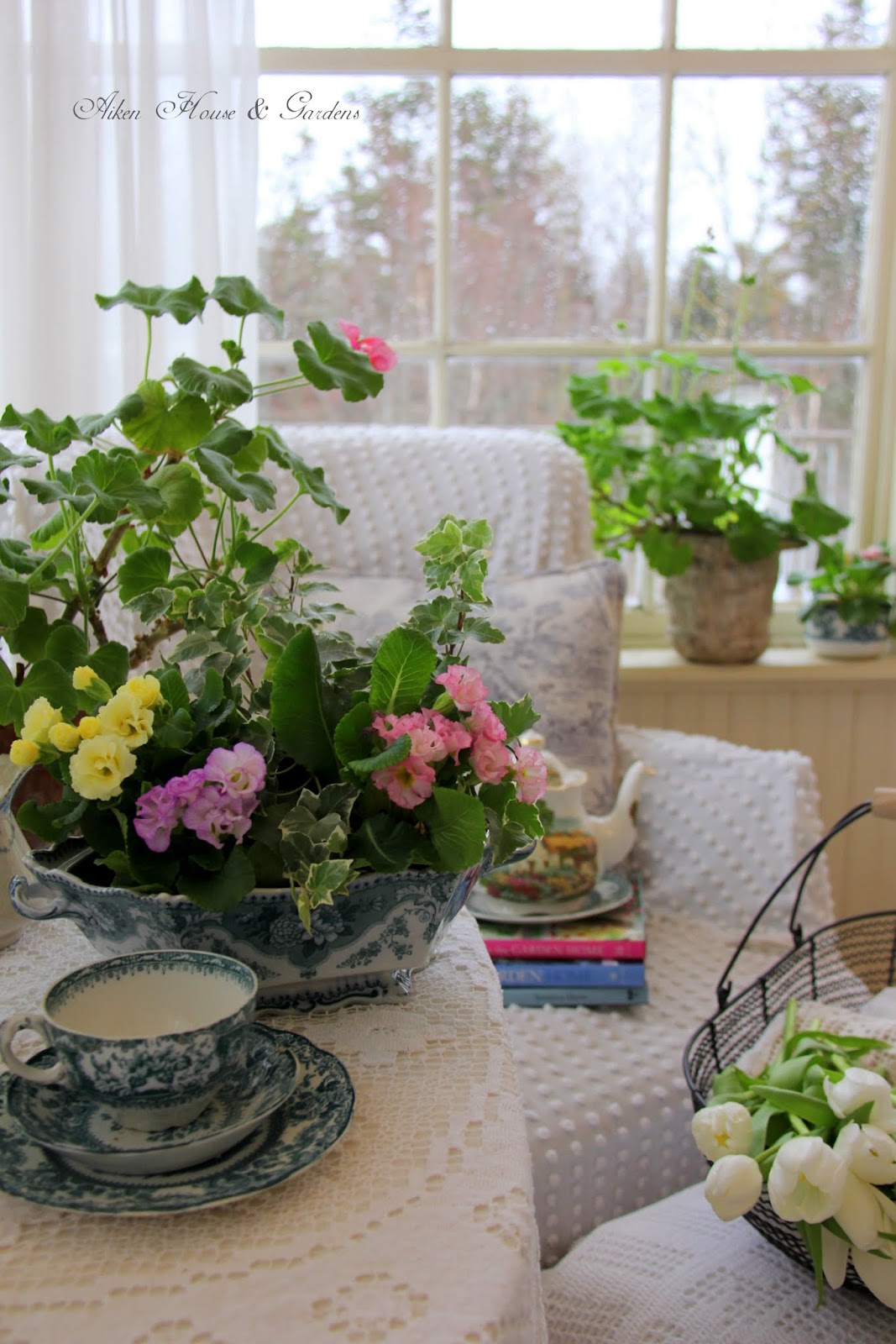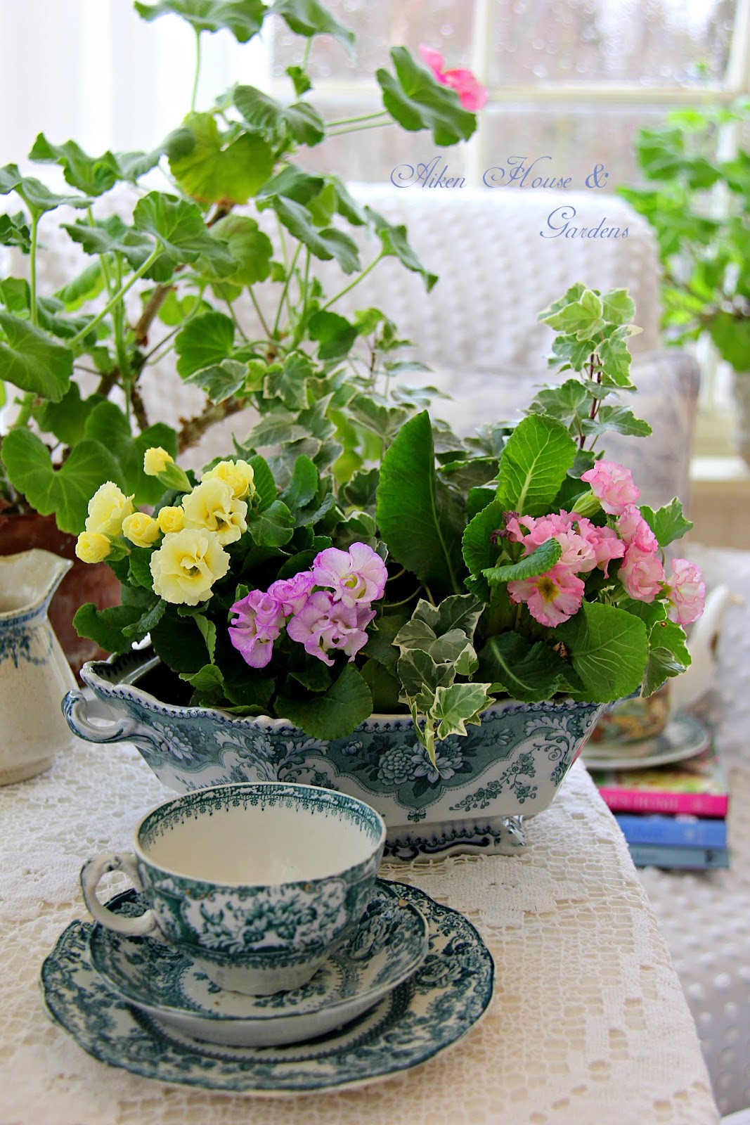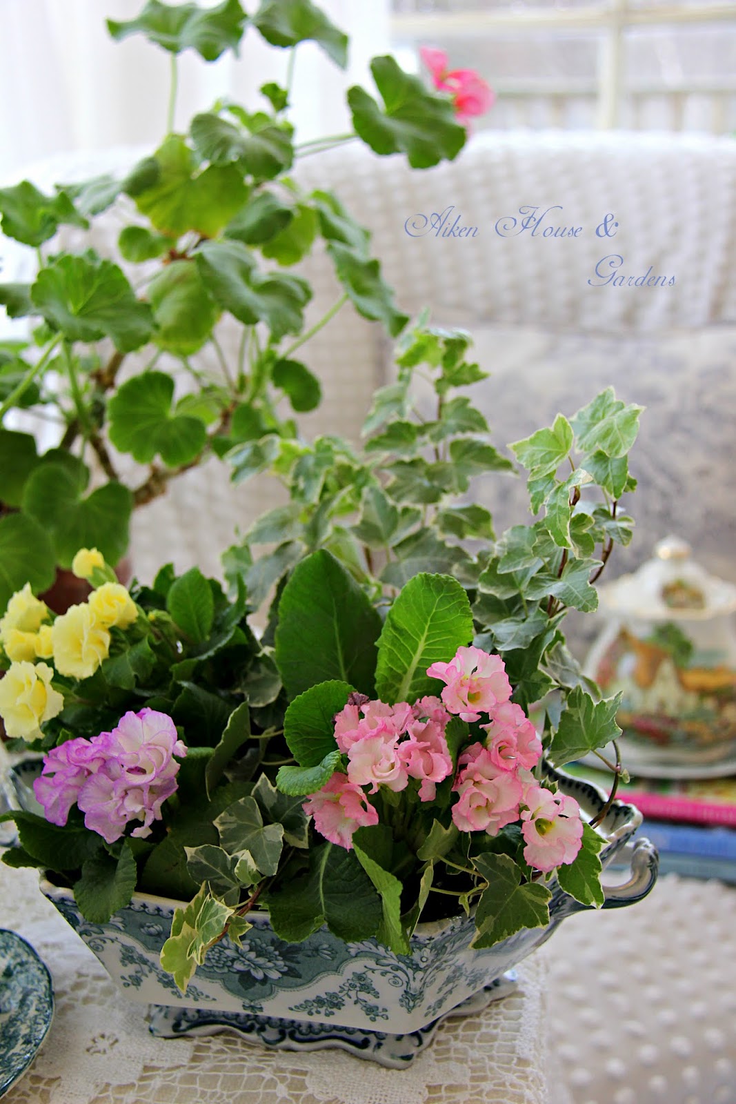 Your tureen filled with spring flowering plants is so pretty. You inspire me to find some this week. Looks like more rain for Thursday. Such an open winter we're having.