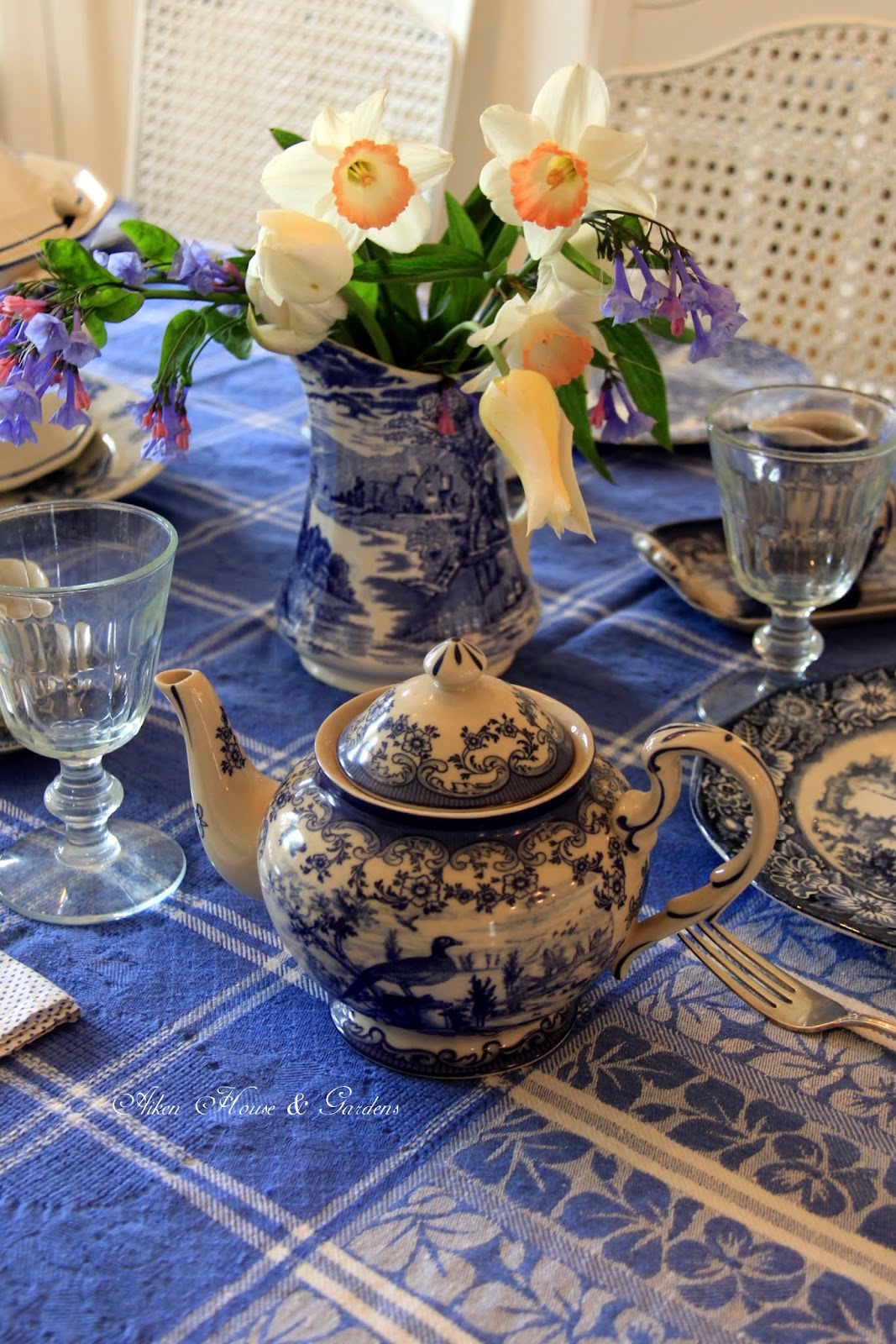 Lovely table setting and tablecloth with your blues.