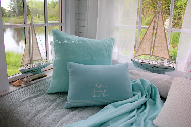 I so love this boathouse and how you decorate it. The soft aquas and blues and white are perfect. I also love the pillows and throw. Summer is finally here and hopefully we'll enjoy some very lovely warm sunny days over the next couple months. Happy Summer days to you Carolyn.