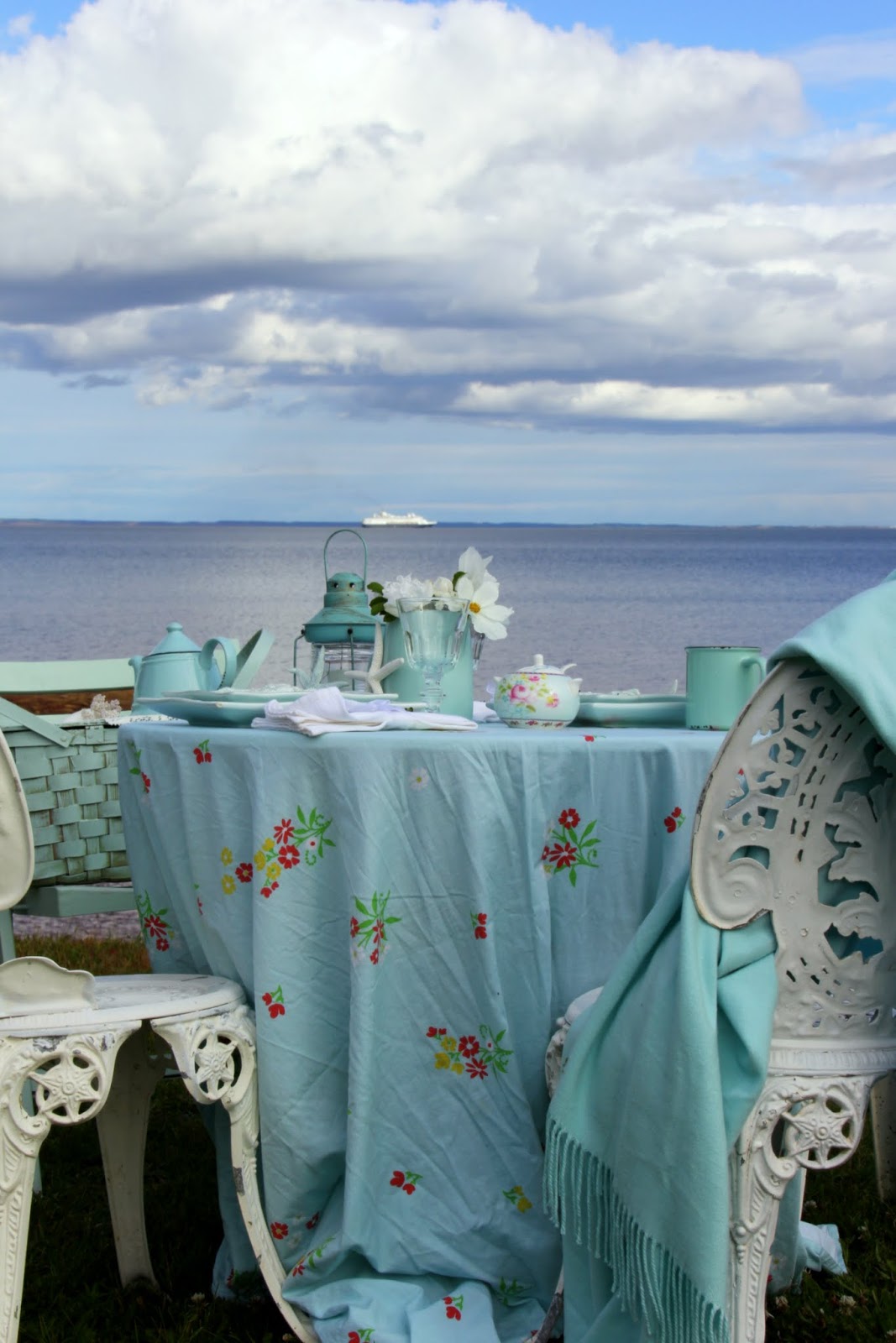 What a very pretty table! I love aqua too. It goes very well with the perfect backdrop - the sea! Relax all you want! It's Summer! :) Kit