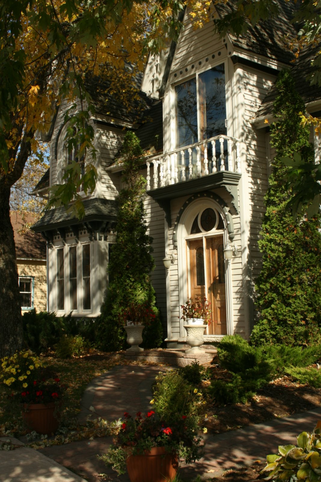 This charming front garden looks like an artists garden. I love the pumpkins decorated for autumn with a mix of fall foliage and hydrangea look so pretty -I may have to copy them.