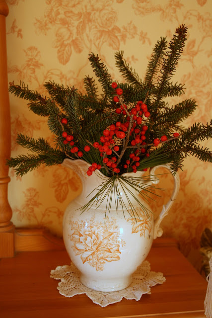 I have the mantel decorated mainly with fresh greenery and winterberries.